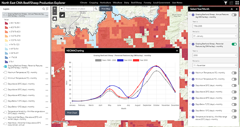 The Beef / Sheep Explorer tool comprises a series of map and graph based views of likely changes in annual pasture growth associated with anticipated changes in the climate. The tool presents the likely changes for annual and perennial pasture systems.