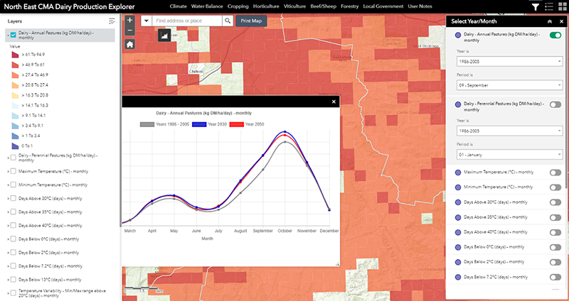 The Dairy Explorer tool comprises a series of map and graph based views of likely changes in annual pasture growth associated with anticipated changes in the climate. The tool presents the likely changes for annual and perennial pasture systems.