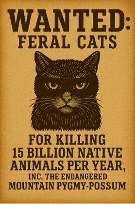 Feral cats kill an estimated 15 billion native animals every year in Australia. More than 200 threatened species list feral cats as a major risk including one of our smallest and most vulnerable mammals, the Mountain Pygmy possum. Fewer than 2,000 remain in the wild.