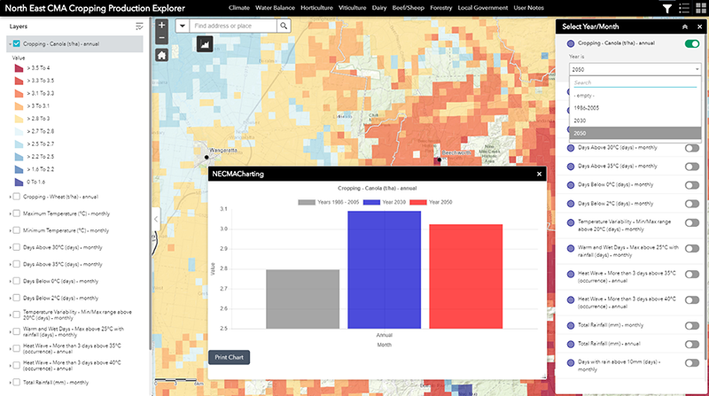 The Cropping Explorer tool comprises a series of map and graph based views of likely changes in annual crop yields associated with anticipated changes in the climate. The tool presents the likely changes for a cereal (wheat) and canola rotation.