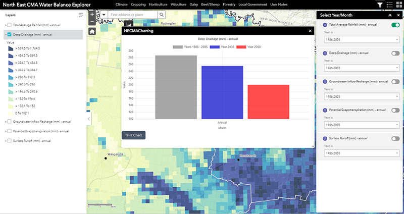 The anticipated impact of climate change on surface water and its availability for agricultural users and the community, is presented in the Water Balance Explorer tool. This tool comprises a series of map and graph based views of likely changes in water balance parameters, such as groundwater recharge, associated with anticipated changes in the climate.