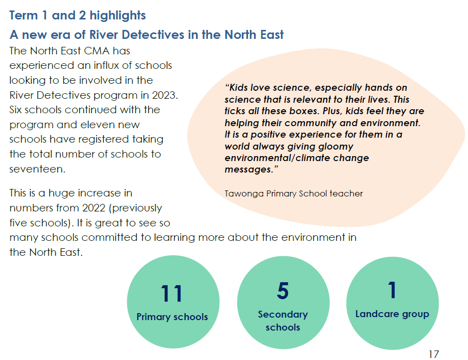 The North East CMA employed a new part-time employee, Anna Hall, to coordinate the delivery of the River Detectives program in 2023. This is an extremely positive move for the region to ensure priority is placed on the program to foster deeper relationships and continuity between the CMA and schools.