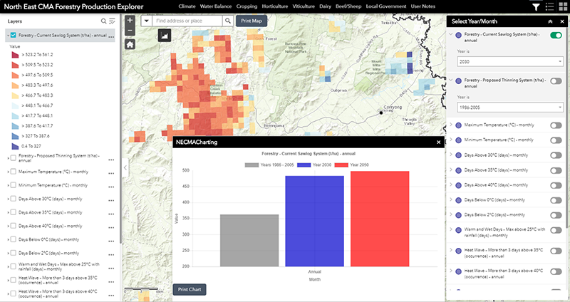 When you commence using the tool by default, the main map view will always initiate with the top layer in the Displayed Map Theme. For the Forestry Explorer this will be the modeled end of harvest yields for Pinus radiata. And the information displayed will be based on the baseline (historic) climate data. You will be able to change the period (to 2030 or 2050), or select another ‘Displayed Map Theme’.