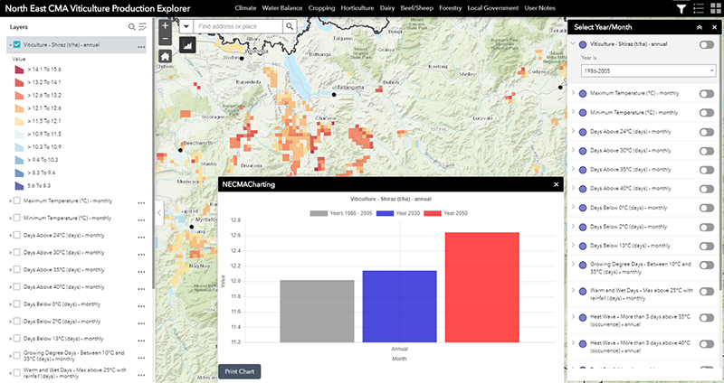 The Viticulture Explorer tool comprises a series of map and graph based views of likely changes in annual crop yields associated with anticipated changes in the climate.  The tool presents the likely changes for Shiraz grapes.